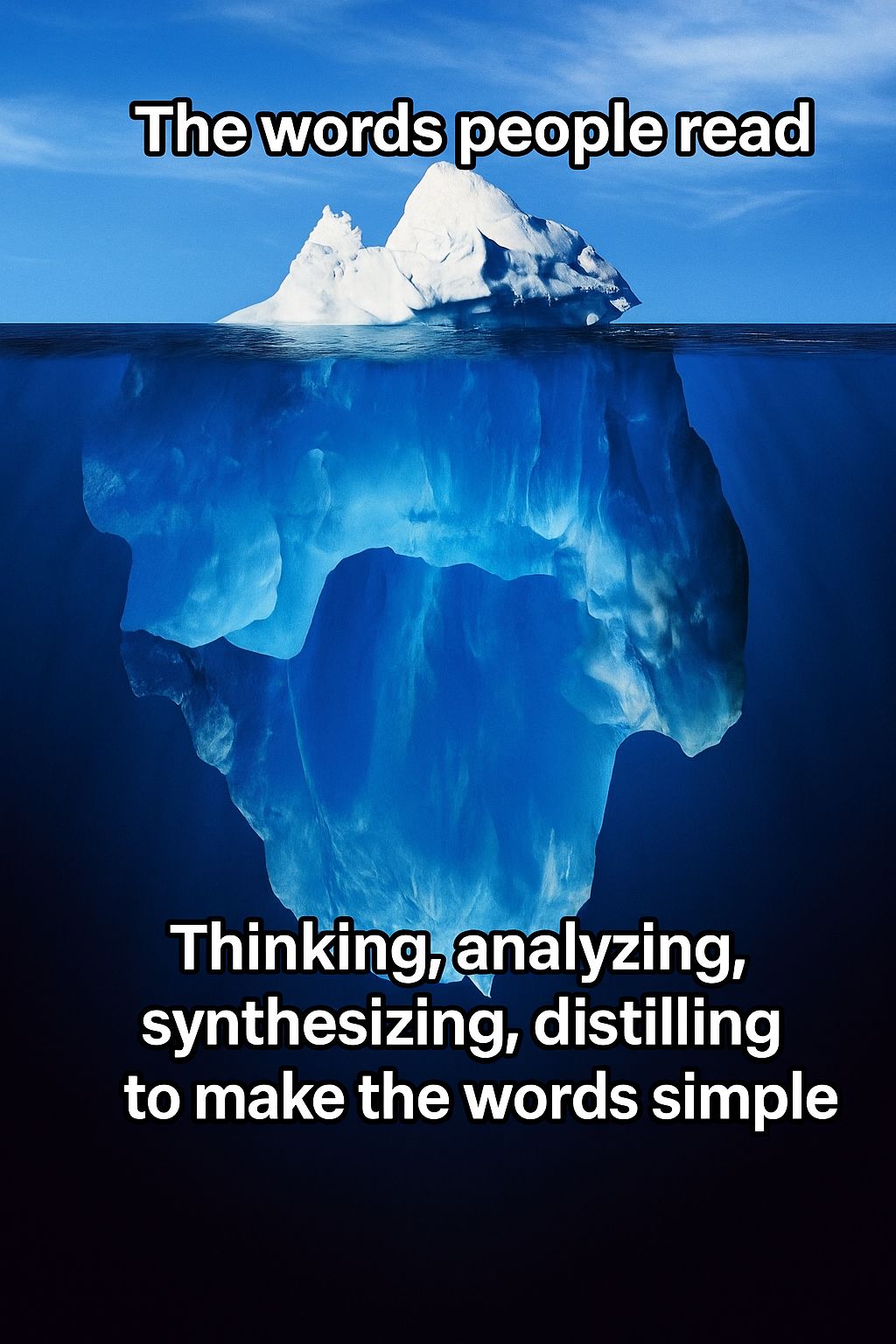 In writing, the 90% nobody sees is the original thinking, analyzing, synthesizing and distilling that makes the final words simple and easy to understand.