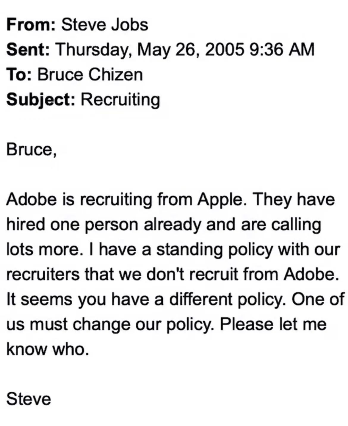 In 2005, Jobs sent Adobe CEO Bruce Chizen an email. Jobs alleged that Adobe was stealing talent from Apple, and he wanted to put an end to it.
